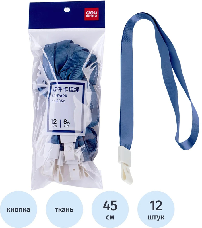 Держатель для бейджа Deli с замком на кнопке. Изготовлен из полиэстера. Цвет: голубой. Ширина тесьмы — 10 мм, длина — 45 см. Поставляется в упаковке по 12 штук.