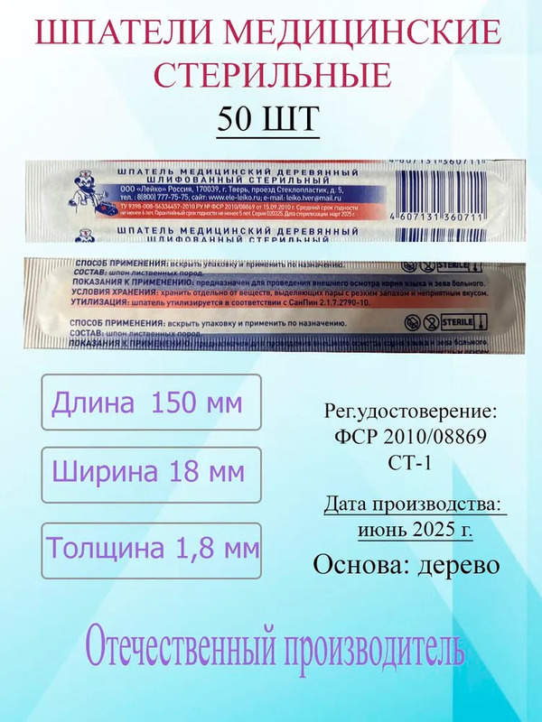 Шпатель медицинский деревянный, 50 шт/уп