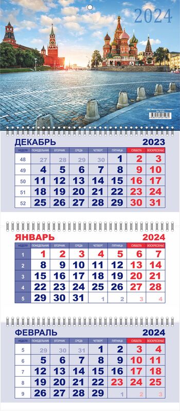 Оформление календарной сетки выполнено в сине-красной цветовой гамме. Курсор-бегунок выделяет текущую дату. Постер и подложки изготовлены из мелованного картона плотностью 250 г/м2, постер с двусторонней ламинацией, сетка выполнена из высококачественной офсетной бумаги. Размер календаря 292х650 мм.