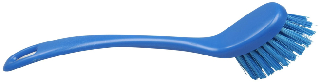 Щетка для мытья посуды FBK средней жесткости 225x35 мм синяя Узкая и удлиненная ручная щетка средней жесткости с износостойкой 5-ти рядной щетиной с распущенными концами подходит для мойки посуды, гастроемкостей, труднодоступных мест, оборудования и любых поверхностей. Имеет сквозное отверстие для подвешивания. Соответствует требованиям ХАССП. Выдерживает температуры от -20°С до 134°С. Допустимо автоклавирование при температуре 134°С. Материал: щетина - полиэстер РBT, основание - высокоплотный полипропилен. Размеры: рабочая часть: 50х35 мм; щетина: средней жесткости, длина 25 мм, толщина 0,30 мм. Цвет: синий.