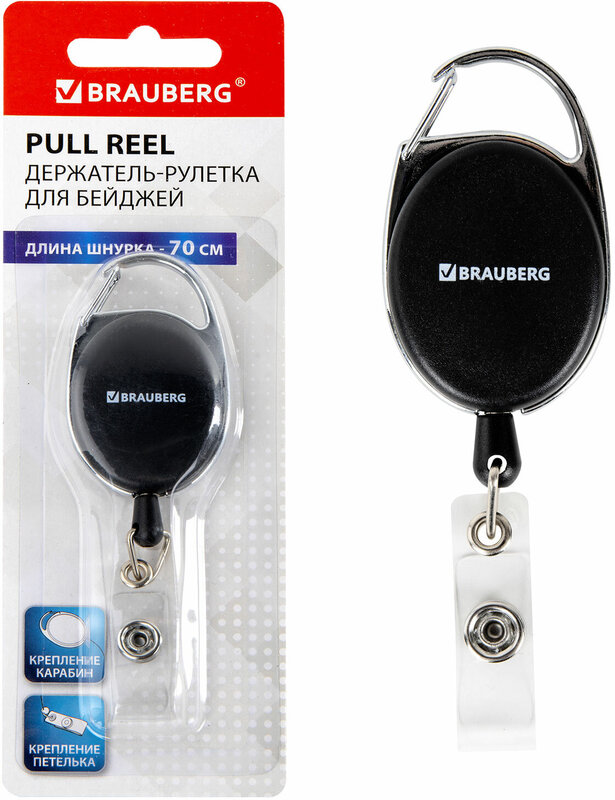 Держатель-рулетка BRAUBERG предназначена для крепления бейджей, магнитных карт, пропусков, ключей и мелкого инструмента.