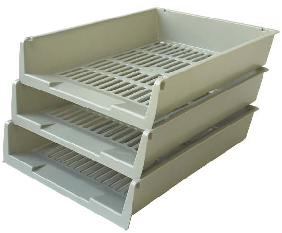 Пластиковый горизонтальный лоток серого цвета для бумаг и журналов. Возможность установки лотков друг на друга. Ширина - 250 мм.
