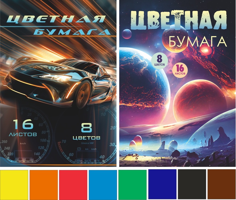 Набор цветной бумаги немелованной А4, 16 листов 8 цветов, Lamark "Главная дорога+Галактика", на скобе, односторонняя, 2 дизайна в коробке