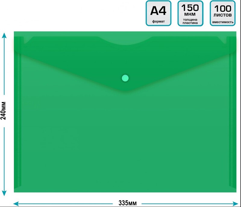 Конверт на кнопке DOLCE COSTO Эконом выполнен из полупрозрачного матового пластика толщиной 0,15 мм, цвет зеленый. Размер 335х240 мм. Предназначен для хранения и транспортировки документов формата А4.