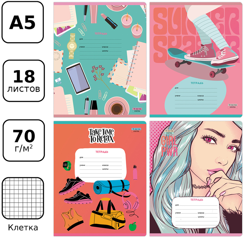 Тетрадь BG серии «Девочки рулят» формата А5 (165*205 мм) на скобе состоит из 12 листов. Внутренний блок – офсетная бумага плотностью 70 г/м², белизна – 100%, линовка – клетка с полями. Обложка тетради изготовлена из мелованного картона с выборочным лакированием. Сзади на обложке размещена таблица умножения. В серии 4 креативных дизайна, которые идеально подойдут для школьниц любого года обучения.