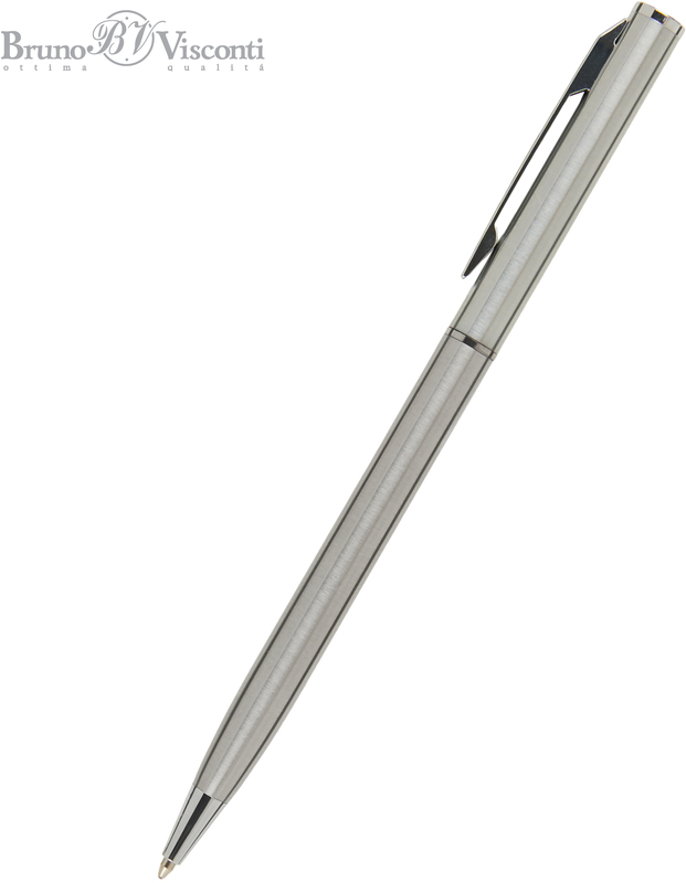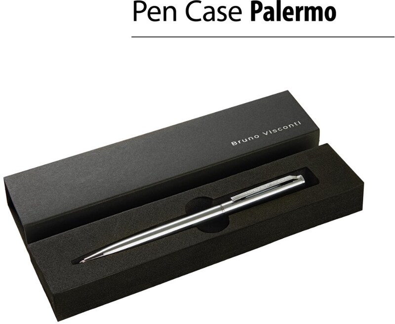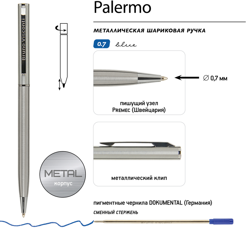 Изящная автоматическая металлическая ручка серии «PALERMO» от Bruno Visconti порадует любителей всего утонченного. Покрытие корпуса Soft Touch гарантирует дополнительный комфорт в работе с ней. Стержень легко выдвигается благодаря поворотному механизму. Синие пигментные чернила DOKUMENTAL (Германия) и пишущий узел Premec (Швейцария) – обеспечивают качественное и мягкое письмо.