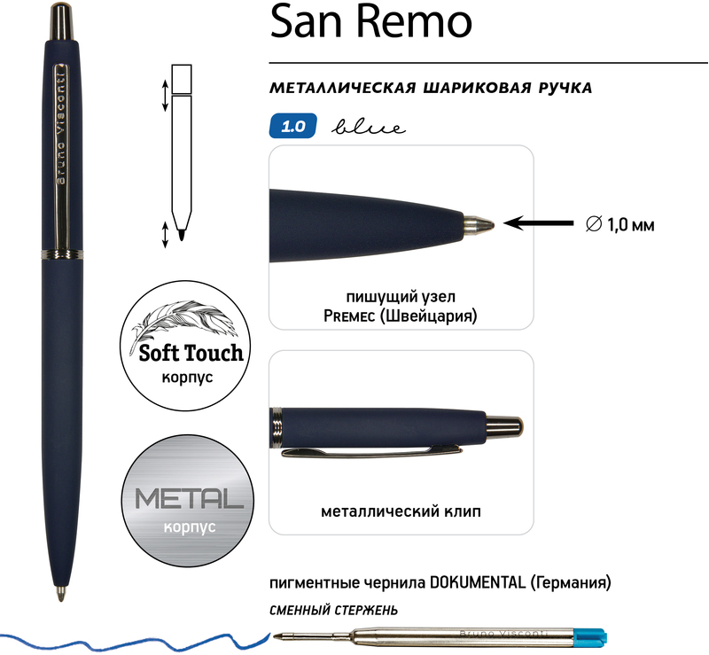 Ручка шариковая автоматическая 1,0 мм синяя SAN REMO (корпус темно-синий, футляр черный) 20-0249/060