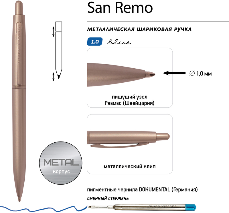 Ручка шариковая автоматическая 1,0 мм синяя SAN REMO (корпус шампань, футляр черный) 20-0249-19/09