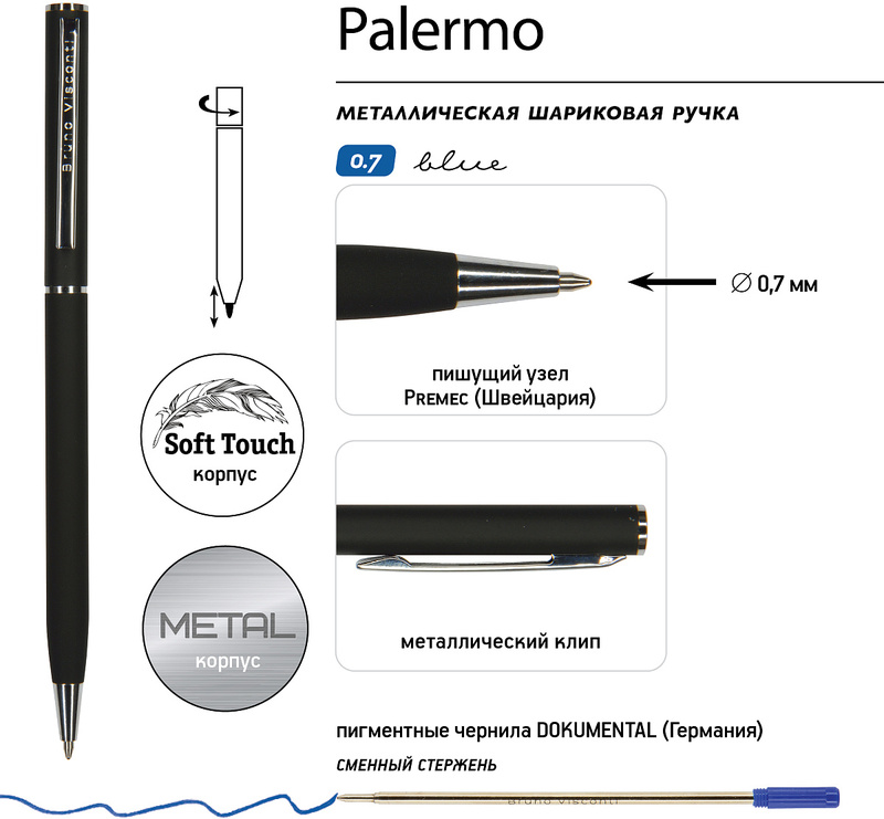 Маленькая автоматическая металлическая ручка серии «PALERMO» от Bruno Visconti порадует любителей всего изящного и утонченного. Покрытие корпуса Soft Touch гарантирует дополнительный комфорт в работе с ней. Стержень легко выдвигается благодаря поворотному механизму. Синие пигментные чернила DOKUMENTAL (Германия) и пишущий узел Premec (Швейцария) – обеспечивают качественное и мягкое письмо.
