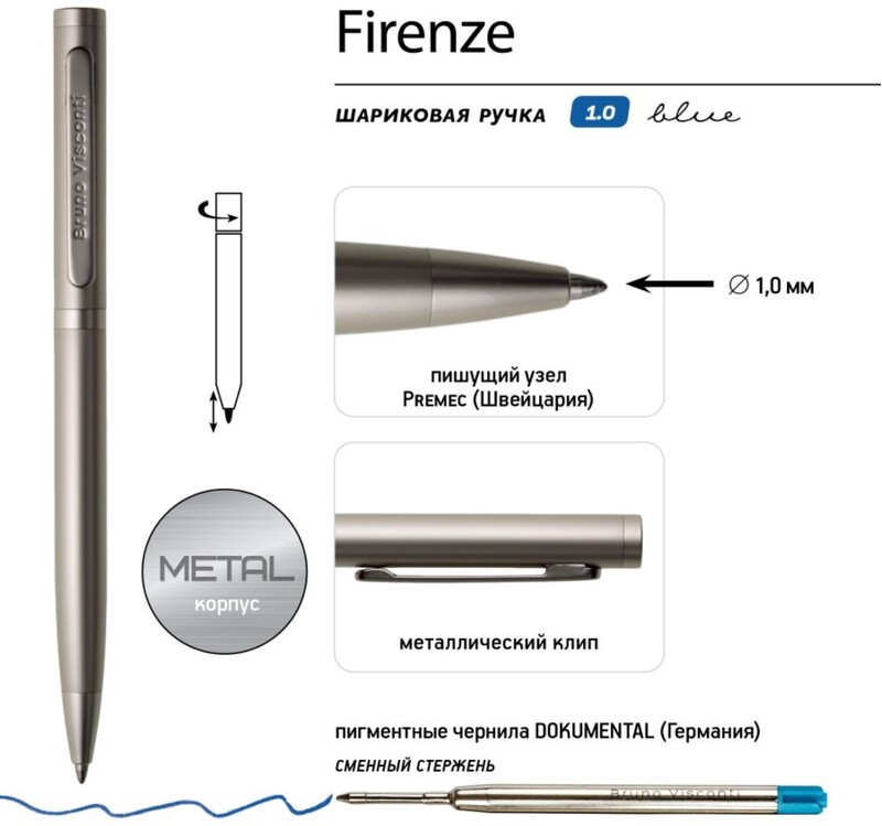 Ручка автоматическая, с легким поворотным механизмом подачи стержня. Надежный пишущий узел d 1,0 мм (от швейцарского производителя Premec) гарантирует высокое качество так же, как и пигментные чернила Dokumental (Германия). Благодаря им писать ручкой «FIRENZE» одно удовольствие – она мягко скользит по поверхности бумаги, оставляя ровную, четкую линию.