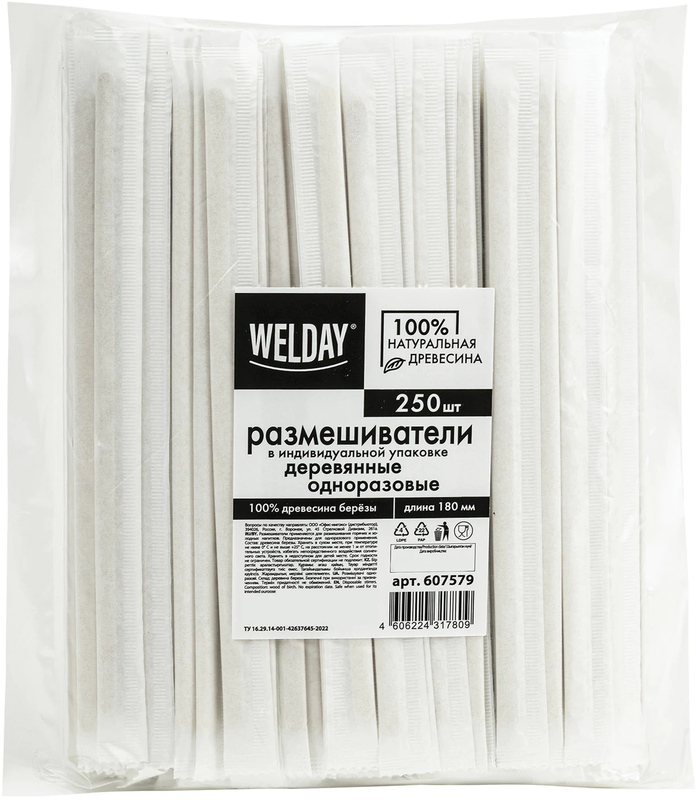 Размешиватели изготовлены из древесины березы. Характеризуются легкостью и безопасностью при использовании, так как не выделяют вредных веществ при взаимодействии с горячей жидкостью. Подойдут как для холодных, так и для горячих блюд (до +95°). Предназначены для одноразового применения, легко утилизируются. Длина - 180 мм. В комплекте 250 штук в индивидуальной бумажной упаковке.