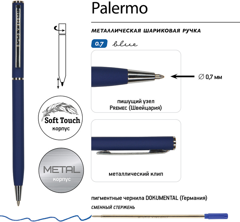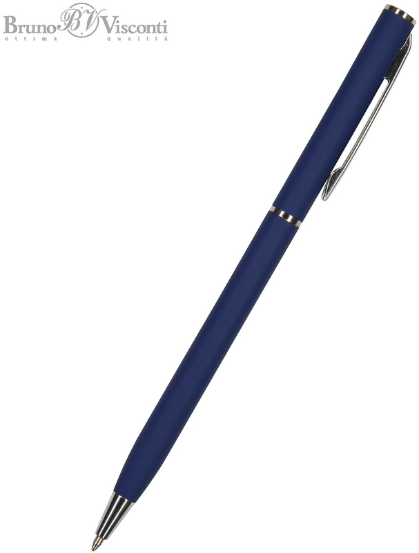 Изящная автоматическая металлическая ручка серии «PALERMO» от Bruno Visconti порадует любителей всего утонченного. Покрытие корпуса Soft Touch гарантирует дополнительный комфорт в работе с ней. Стержень легко выдвигается благодаря поворотному механизму. Синие пигментные чернила DOKUMENTAL (Германия) и пишущий узел Premec (Швейцария) – обеспечивают качественное и мягкое письмо.