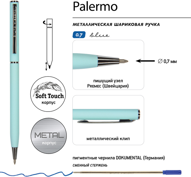 Маленькая автоматическая металлическая ручка серии «PALERMO» от Bruno Visconti порадует любителей всего изящного и утонченного. Покрытие корпуса Soft Touch гарантирует дополнительный комфорт в работе с ней. Стержень легко выдвигается благодаря поворотному механизму. Синие пигментные чернила DOKUMENTAL (Германия) и пишущий узел Premec (Швейцария) – обеспечивают качественное и мягкое письмо.
