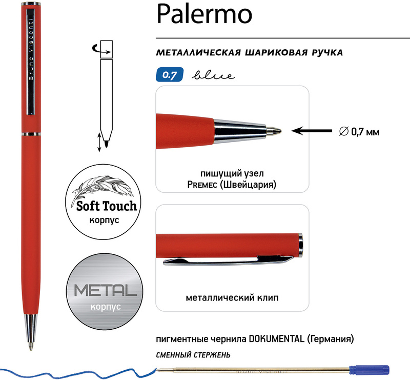 Изящная автоматическая металлическая ручка серии «PALERMO» от Bruno Visconti порадует любителей всего утонченного. Покрытие корпуса Soft Touch гарантирует дополнительный комфорт в работе с ней. Стержень легко выдвигается благодаря поворотному механизму. Синие пигментные чернила DOKUMENTAL (Германия) и пишущий узел Premec (Швейцария) – обеспечивают качественное и мягкое письмо.