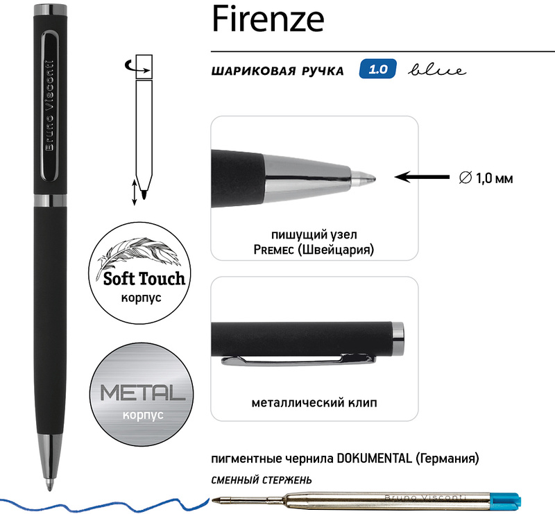 Лаконичный дизайн, прочный металлический корпус, строгость формы подчеркнут статус владельца ручки. Удобство в эксплуатации и тактильно приятные ощущения подарит бархатистое покрытие Soft Touch.