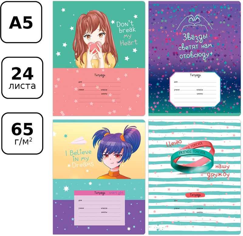Тетрадь BG серии Star формата А5 (165*205 мм) на скобе состоит из 24 листов. Внутренний блок – офсетная бумага плотностью 65 г/м², белизна – 100%, линовка – линия с полями. Обложка тетради изготовлена из мелованного картона. Сзади на обложке размещен Гимн России. Обложка выполнена в милом и креативном дизайне. Тетради отлично подходят для школьниц любого года обучения и обязательно понравятся девочкам.