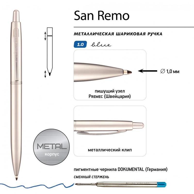 Металлическая шариковая ручка «San Remo» - аксессуар, призванный стать настоящим элементом стиля, подчеркнуть индивидуальность его владельца.