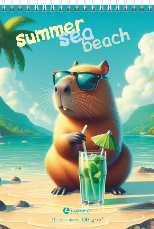 Скетчбук Капибара на пляже, А5, 40 л., 100 г/м2, выборочный уф-лак, твердая подложка, спираль сверху