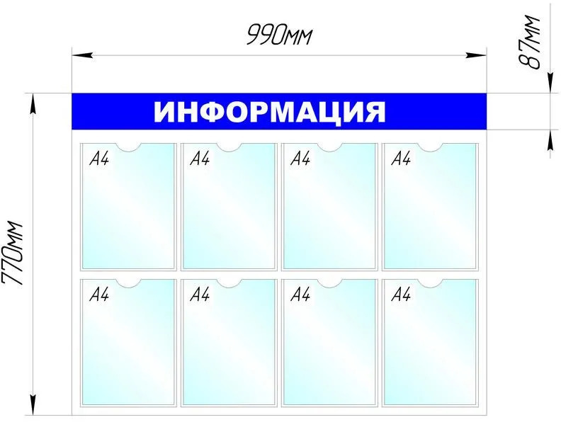 Информационный стенд 99x77 см 8 карманов A4 Attache Информация белый/синий Изготовлены из матового белого ПВХ (коматекс) пластика толщиной 5 мм. Текст - аппликация синим пластиком 3 мм. Карманы - прозрачный ПЭТ 1 мм, разделители - белый пористый самоклеящийся материал 4 мм. Поставляется с элементами крепежа.