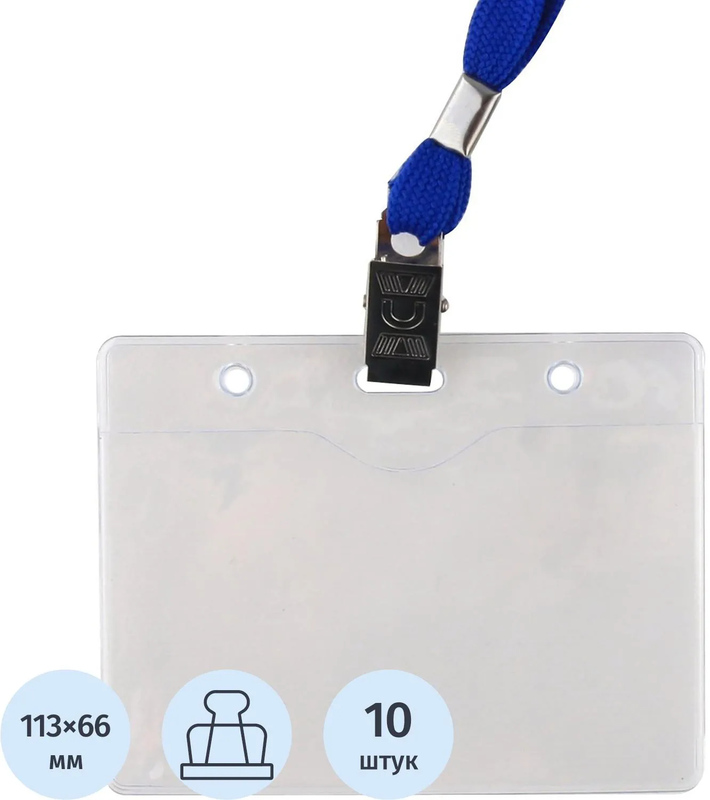 Бейдж Attache Economy с тесьмой горизонтальный. Размер бейджа — 120×87 мм. Плотность ПВХ пластика — 23 мкм. Цвет бейджа — прозрачный. Материал тесьмы — полиэстер, цвет — синий, длина — 45 см, ширина — 1 см. Имеет два держателя — металлический зажим и тесьму. Подходит для ношения именных карточек и пропусков. Поставляется по 10 штук в упаковке.