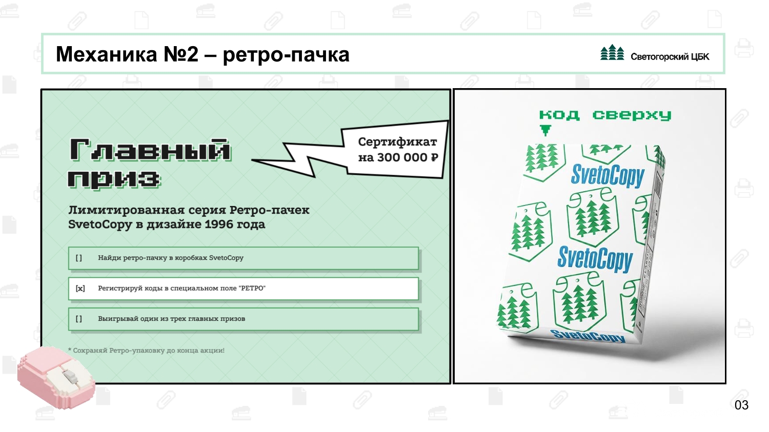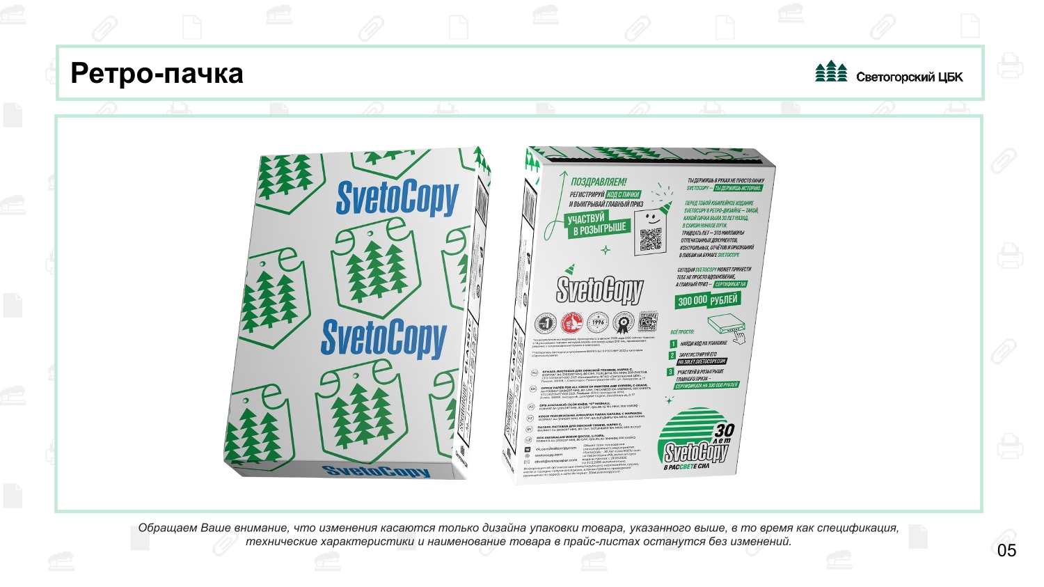 В честь юбилея Светогорский ЦБК выпустил лимитированную серию Ретро-пачек SvetoCopy, вдохновленную дизайном 1996 года. Ретро-пачка – шанс на получение главного приза!