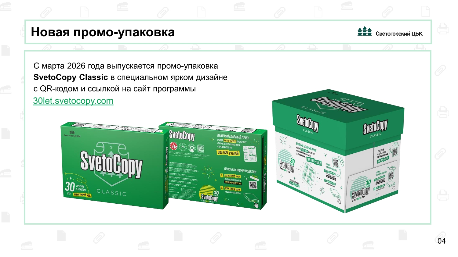 С марта по декабрь 2026 года бумага SvetoCopy Classic выпускается в новой упаковке, содержащей информацию о кампании, а также QR-код, с помощью которого можно перейти на сайт кампании «SvetoCopy – 30 лет в раСВЕТе сил».